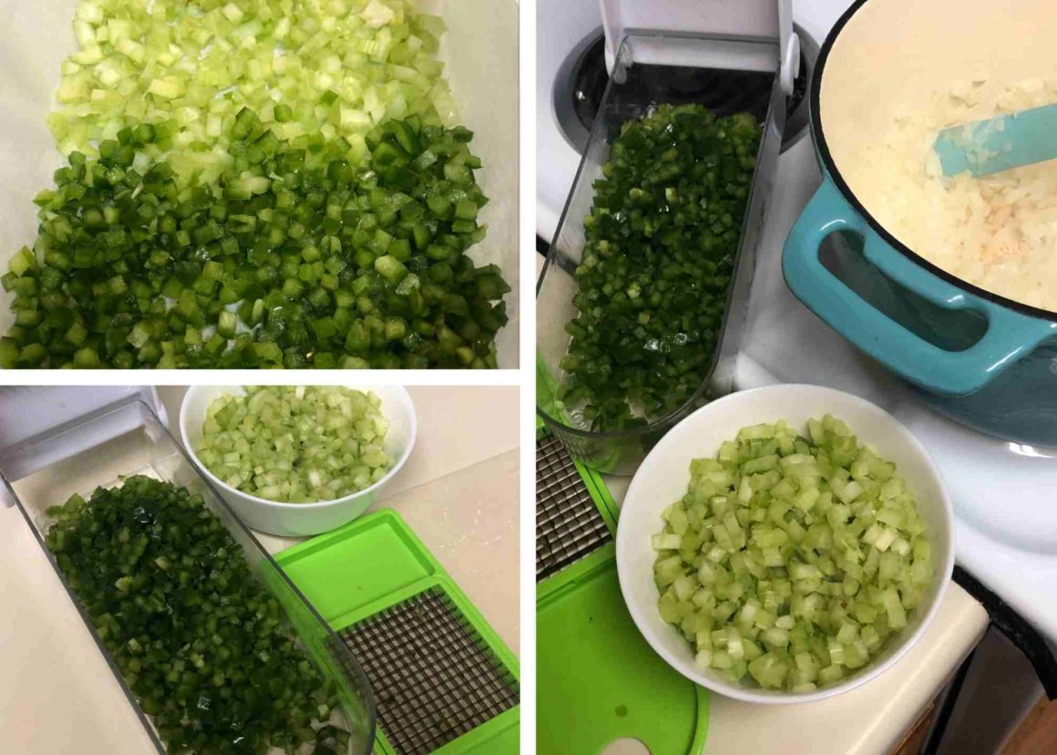 This chop wizard is one of those kitchen tools that you probably think you can do without, after all it’s just a bunch of knives, but it saves SO MUCH TIME. I HATE cutting onions… and also celery, peppers, and other stuff that must be diced. It makes me cry and its hard to get everything similarly sized.