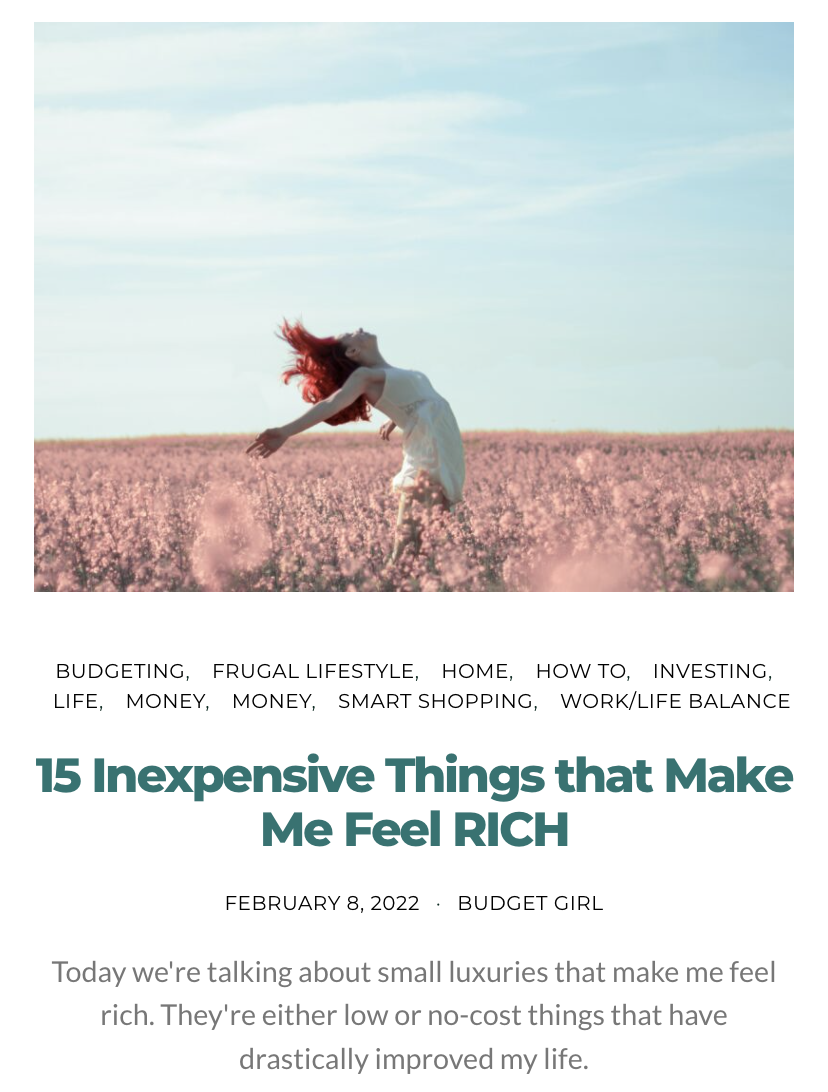 Although I’m a big advocate for living a frugal lifestyle, that doesn’t mean I don’t like to have fun and treat myself on occasion! In fact, I really enjoy the little luxuries that I’ve added to various routines and parts of my life that make me feel richer. Find out more about what inexpensive things I do that make me feel rich.
